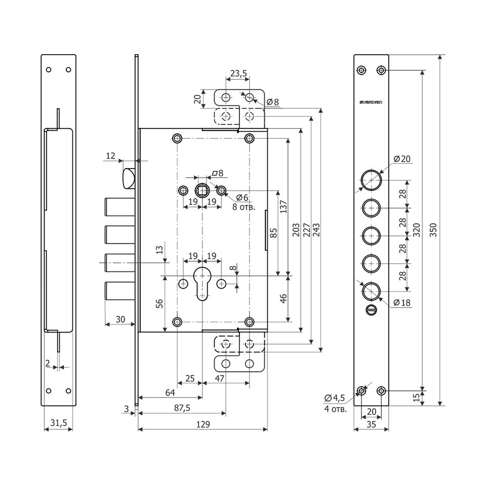 Корпус Guardian (Гардиан) врезного замка с защёлкой ЗВ 72.16 Т с тягами. /128:4140/ в zel-dveri.ru.